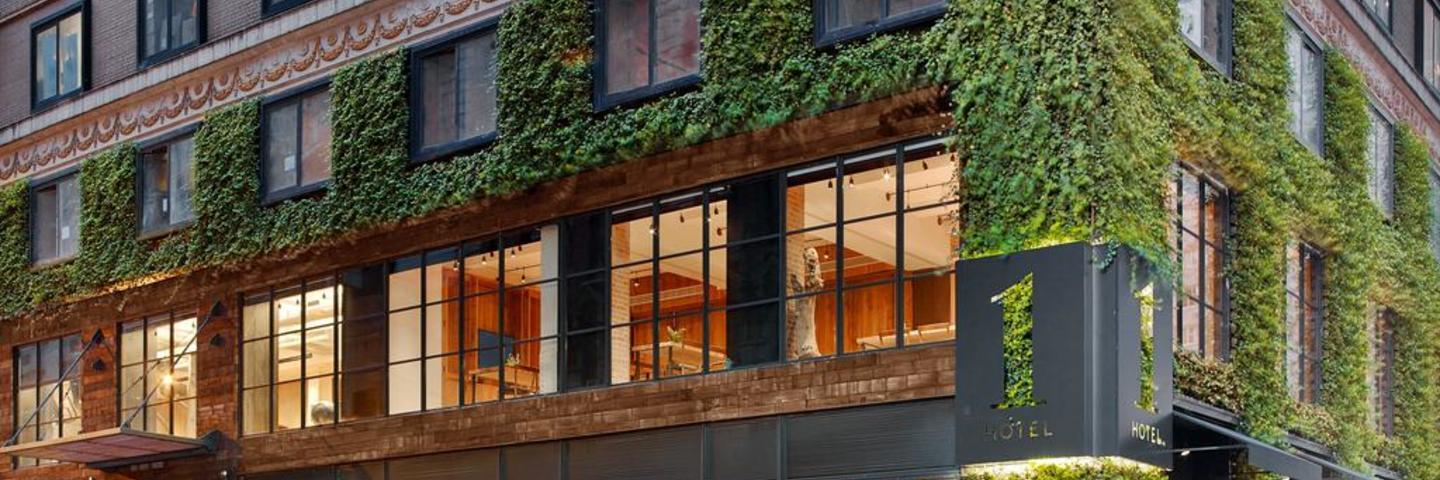 Clear from first glance at its ivy-clad facade, the 1 Hotel marries modern luxury with eco-conscious design and sustainable architecture. Wooden wall panels reclaimed from retired state water towers line the antique brick walls of its tree-filled lobby. Guest rooms all feature Keetsa hemp-blend mattress, 100% organic cotton sheets, live-edge wood desks, and reclaimed barnwood ceilings. Chalk-boards have replaced nightstand notepads, and cardboard coat hangers fill the closet rather than plastic ones.