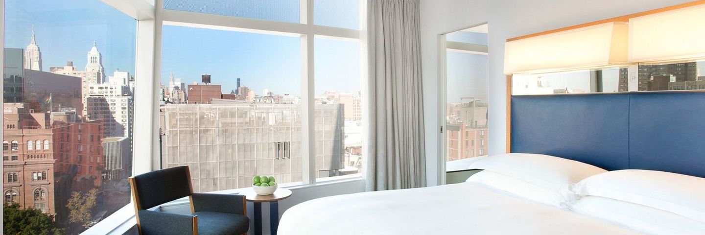 Shortly after it opened, The Standard took over the struggling Cooper Square Hotel. It was a shrewd move. The sleek glass and steel construction by architect Carlos Zapata had raised a howl among East Village preservationists but by the time The Standard took over in 2011, they had grown accustomed to it. Some even liked it. With wraparound glass walls, the 105 retro rooms, full of custom mid-century-seeming furniture, huge flatscreen TVs, and tiled bathrooms, feel like a part of the East Village. And at between 250 sq. ft. and 625 sq. feet in the corner suites, the rooms are East Village size too. Andre Balazs aesthetic is fine tuned here, apparent in everything from the bookshelves, stocked with vintage books, to Narcissa Restaurant with organic produce from Balazs’ Hudson Valley farm.