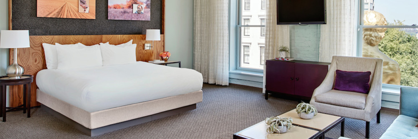 91 spacious guest rooms with high ceilings and large windows provide a residential respite from the thought-provoking galleries below. Some even feature original historic features such as exposed brick walls, and all are outfitted with custom-designed furniture, comfortable beds, plush robes, and Malin + Goetz bath amenities. The hotel's farm-to-table restaurant Proof on Main serves the bounty of the Ohio River Valley, including over 120 Kentucky Bourbons.